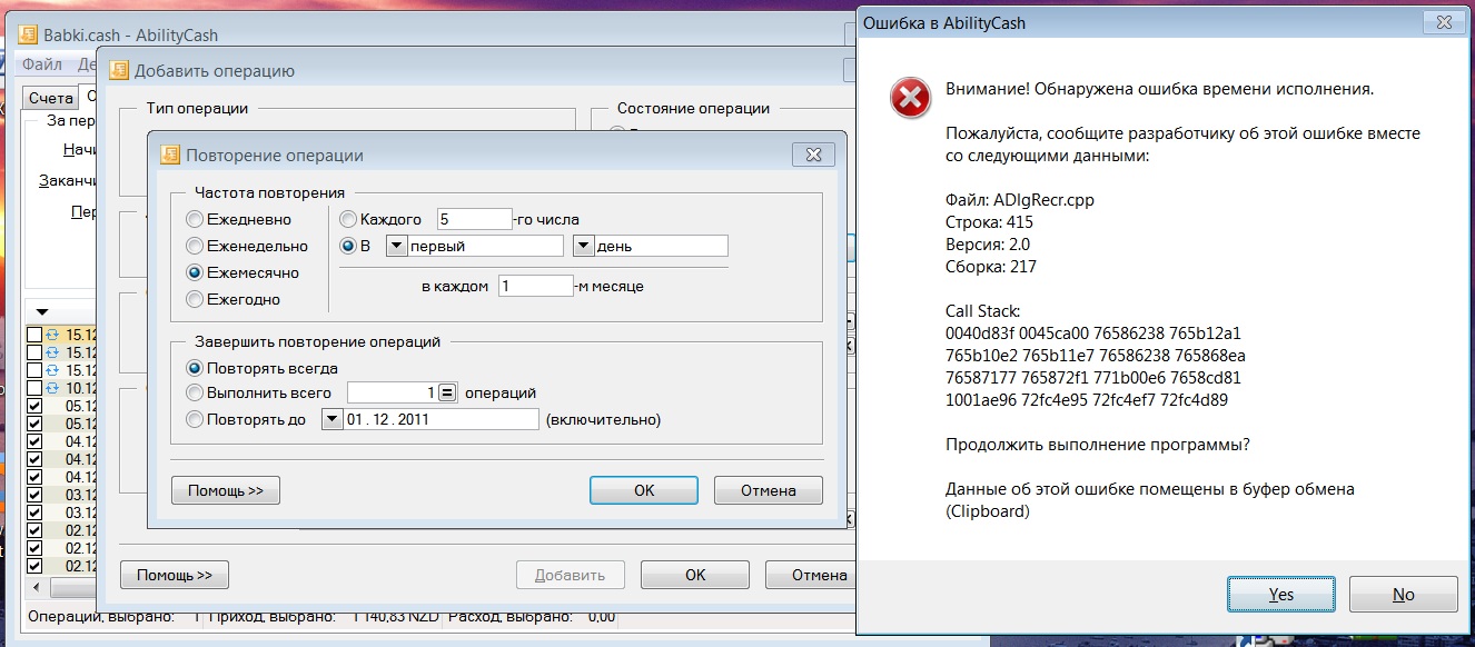 Операции - Добавить - Расход, Не выполнена и повторяется, - Повторение - Ежемесячно, В, последний, день - Ок - ОШИБКА
