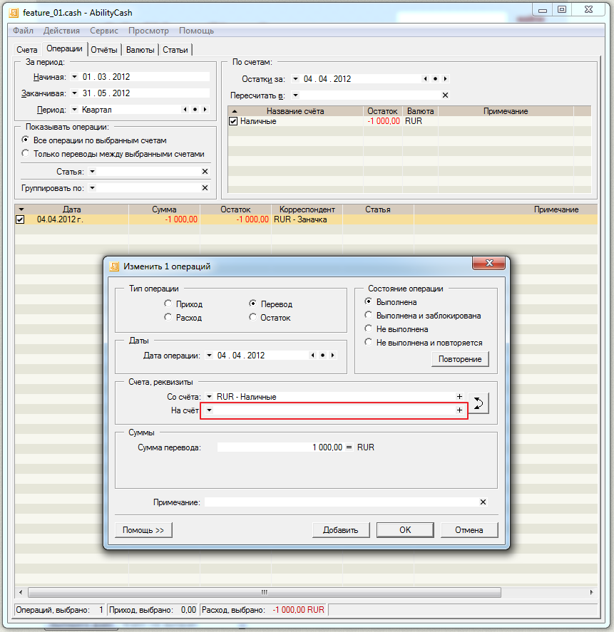 Если в операции перевода один из счетов заблокирован и скрыт, то отображение этой операции, при редактировании не совсем корректно: заблокированный счет исчезает из формы и она остается пустой (в предыдущих версиях устанавливалось на "Все счета", что еще более не верно). Т.о. при попытке изменения, допустим, суммы перевода, мы либо получаем сообщение "Не указан счет...", либо вообще теряем одного из участников перевода.