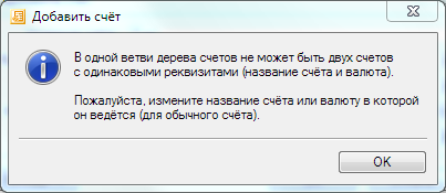 Дело в том, что если программа будет допускать добавление двух счетов с одинаковым названием (и в одинаковой валюте), то эти счета окажутся неразличимыми если добавляется новый план счетов или пользователь выбирает просмотр линейного списка счетов, без папок.