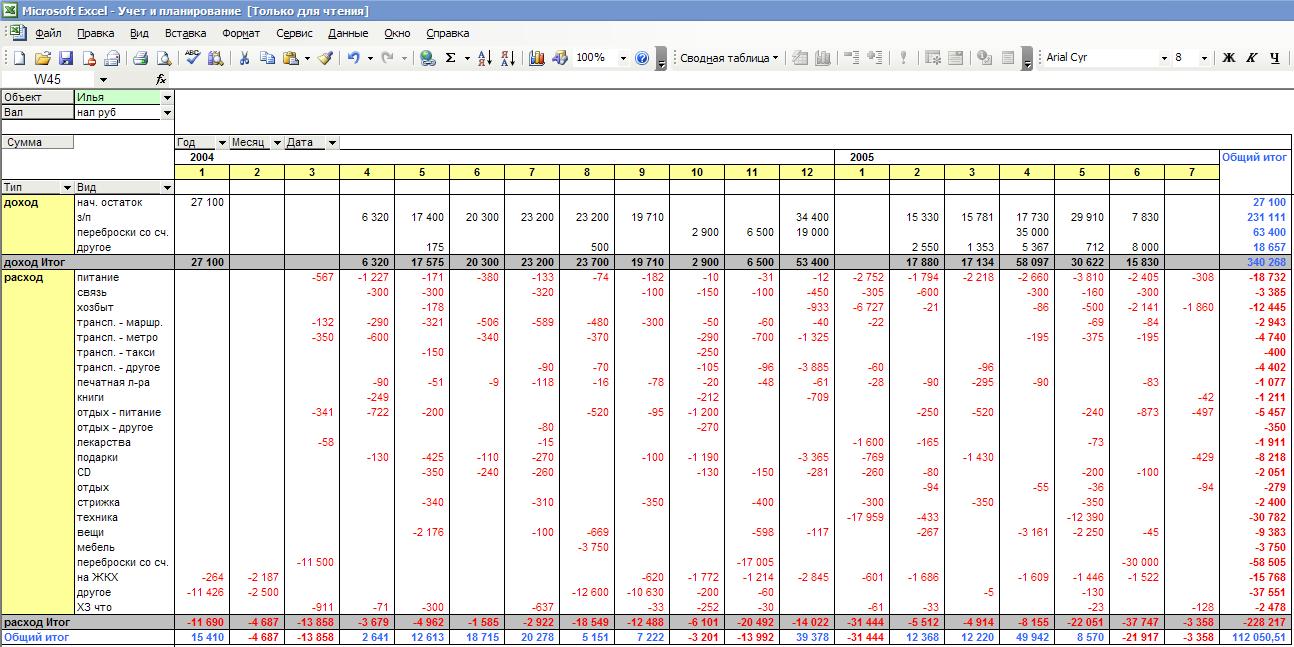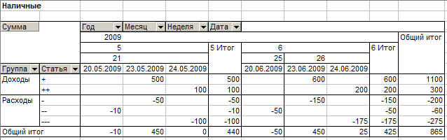 Сделал в сводной таблице в екселе, там же можно схлопнуть столцы (год\месяц\неделя). На большом периоде очень удобно анализировать потоки.
