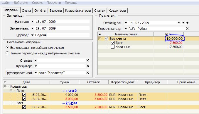 А если они будут в разных валютах? В программе уже все для этого разработано: Важный момент - в счетах галочка стоит напротив только счета "Долг-RUR", поэтому валюта одна. Теперь обратим внимание на статусную строку, если я выберу группу "Петя" (см. скриншот) - там уже все посчитано. Нужную сумму я всегда сейчас увижу, бегая курсором по группам, а хотелось бы увидеть их все сразу. Если выбрано несколько счетов разных валют, то и поведение в статусной строке другое (пишет "разные валюты"). Этого достаточно. P.S. В принципе, есть есть курсы валют, а в счетах выбрано "пересчитать в", то можно суммы по группам счетов считать в выбранной валюте, как реализовано в счетах. Файлы: |